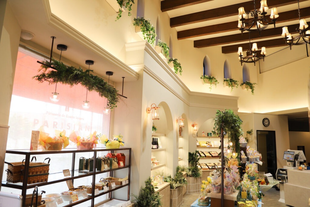 曲線を活かした美しいショーケース配置とシャンデリアなどの装飾により、まるでパリの街角にあるような雰囲気を感じられる空間となっています。
